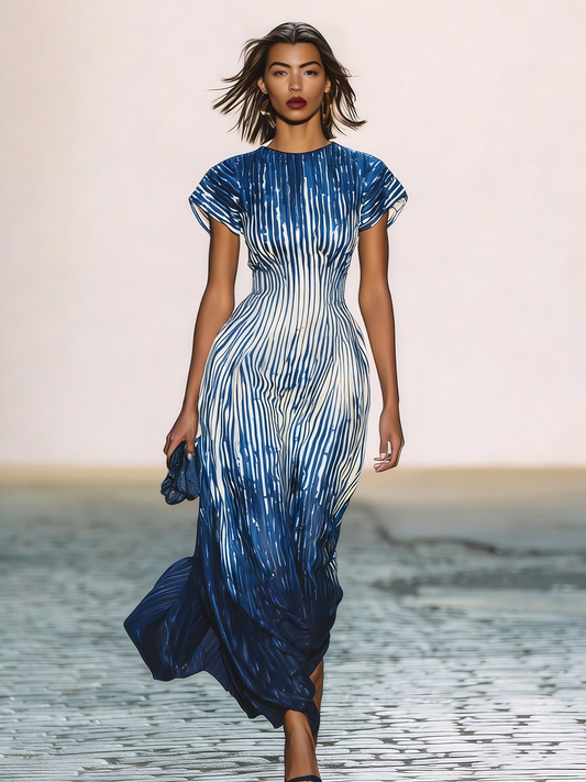Maeyira Blue Ombre Stripe Maxi Dress Short Sleeve Flowy